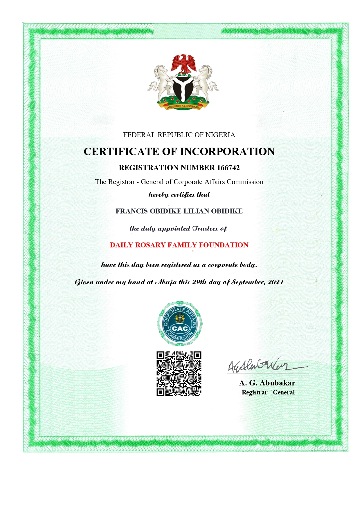 Daily Rosary Family Foundation is a registered not-for-profit, non-political organisation in Nigeria. Our mission includes: